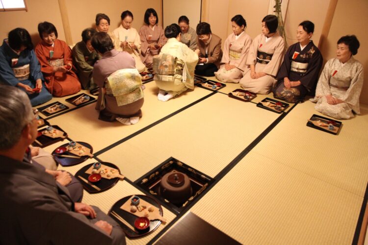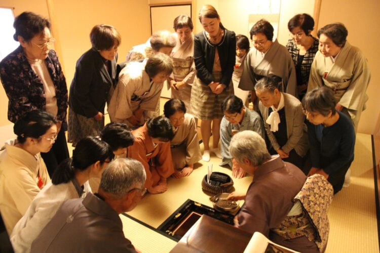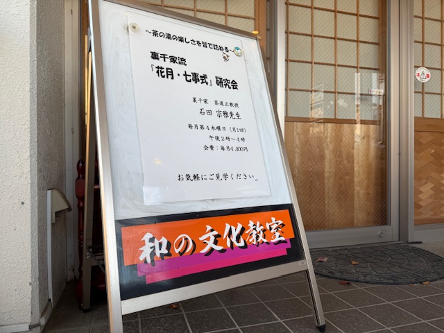 裏千家流「花月・七事式」研究会は毎月1回、第4木曜日午後2時から4時まで。裏千家茶道正教授・石田宗雅先生の指導で七事式の数々を修練しています。和室には椅子も用意されており、正座がむずかしい方も安心して参加できます。