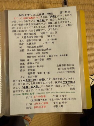毎月の月釜が終わると、当日の席の趣向、会記、次回の予告と内容盛りだくさんの「『月釜』報告」を作成し、ハガキに印刷して過去に参加された方などに送っているそうです。田口さんは「『今回は行けるから行ってみよう』と思い立ったときにお気軽に来ていただければうれしいです」と話しています。月釜を始めてから15年にわたって続けられている、記録としてもたいへん貴重なものです。