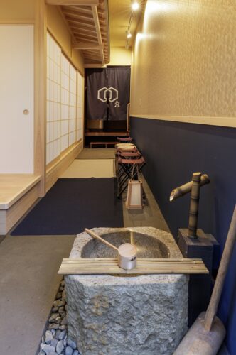 内露地に置かれたつくばいは、50年前まで菓子作りに使われていた石臼。