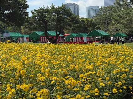 キバナコスモスが咲き乱れるお花畑に隣接する内堀広場には「野点」用のテントが設営されました。