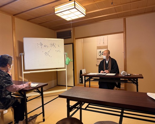 教室は床の間を正面にして講師の僧侶の方が座られ、対面する形での受講となります。下の画像のように机と椅子が用意されており、座って受講できることから話を聞きやすく、メモも取りやすかったです。