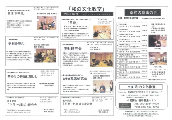また、「和の文化教室」様では禅語のみならず、香道や能楽、史料を読む、七事式などの専門的な講座、研究会もあります。幅広い和の文化に親しむことのできる教室が都心から1時間圏内の場所にあることに驚くと共に、私も様々な和の文化を知りたいと思う契機となりました。